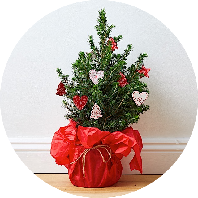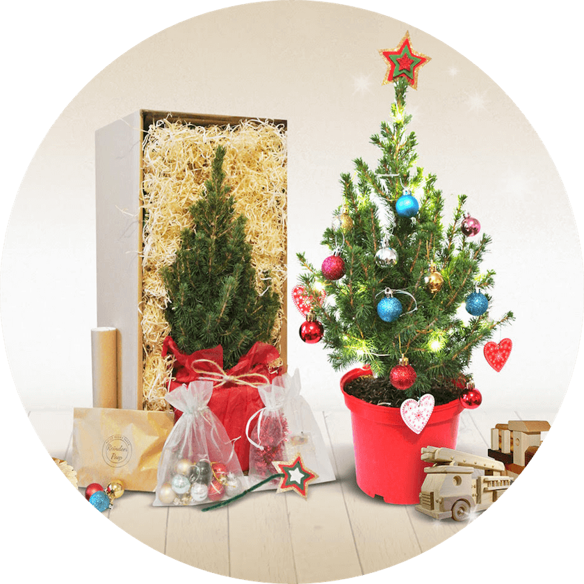 Traditional, multi coloured hanging baubles. The tree is sent in a box with woodwool and makes for a really attractive present. It does not need to be potted, it is ready to go and can be decorated immediately with the lights, decorations and star.