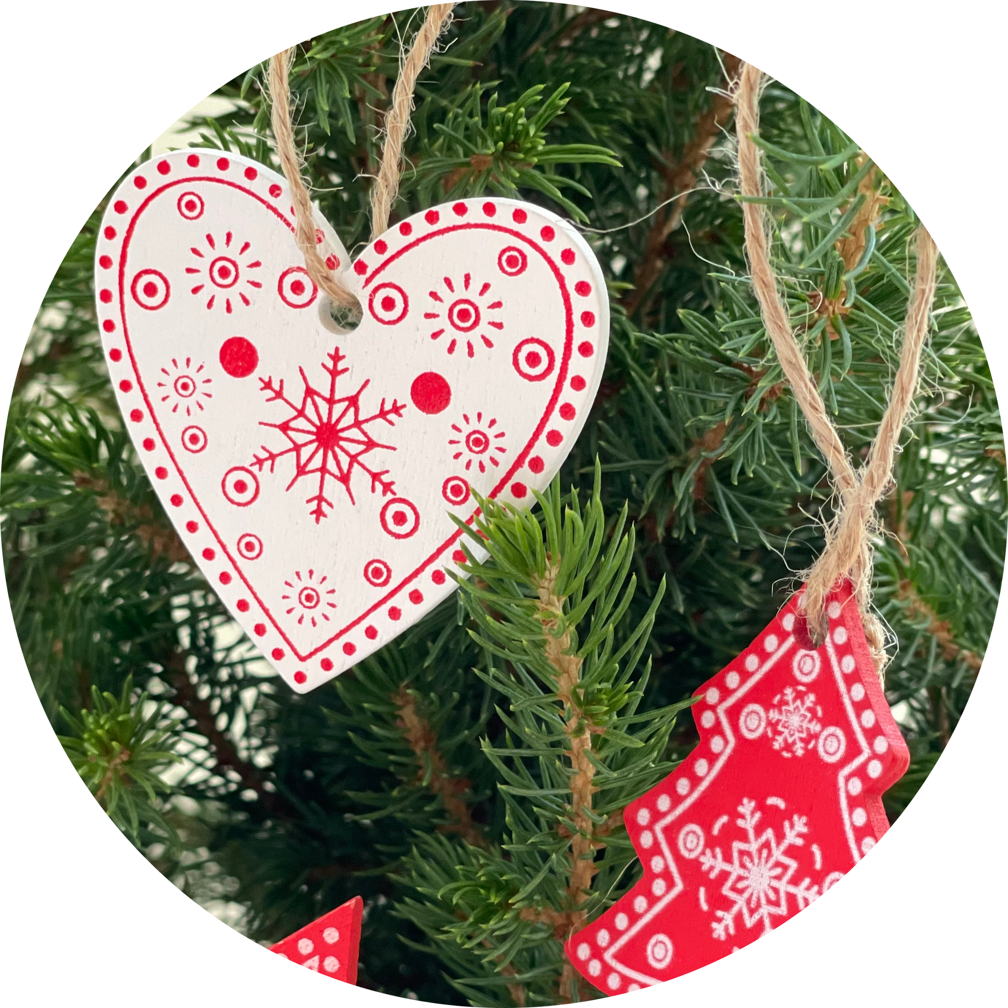 Bringing a Scandinavian Hygge vibe to our tabletop trees. These red and white wooden decorations are eco and sophisticated.